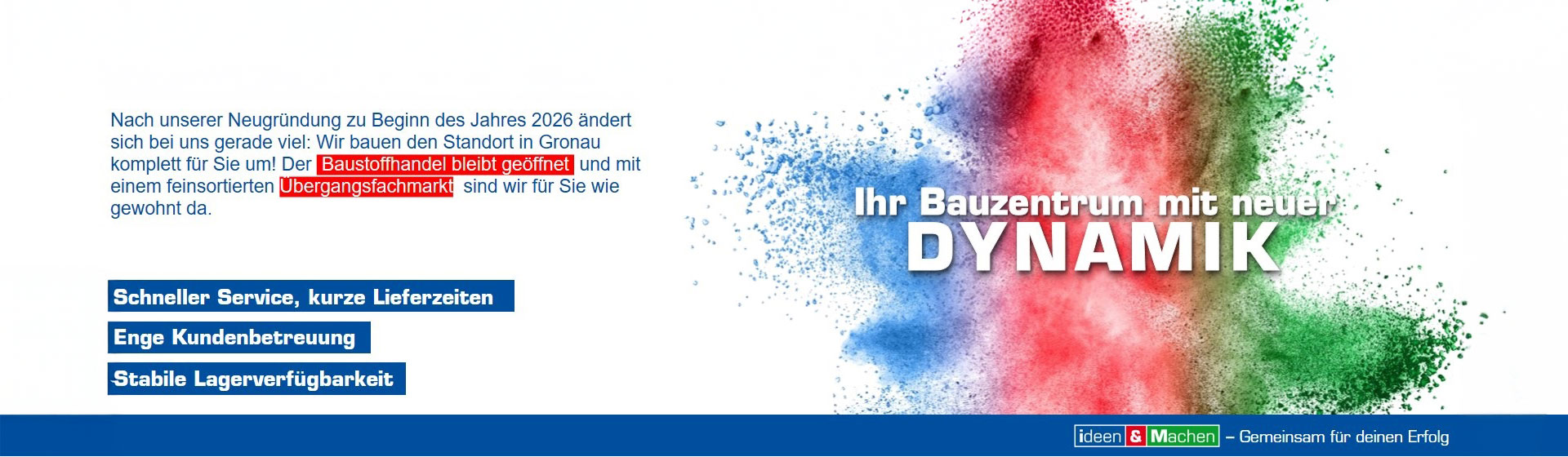 Obwohl unser Unternehmen erst Anfang 2026 gegründet wurde und unser Standort derzeit modernisiert wird, stehen Ihnen unser umfassender Baustoffhandel und unser fein sortierter Fachmarkt in Gronau bereits vollständig zur Verfügung.